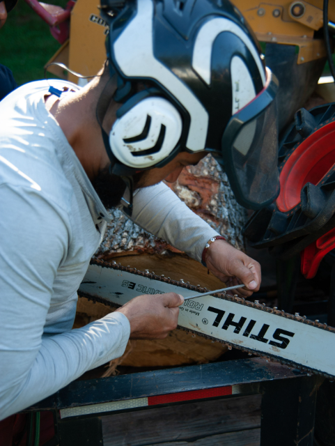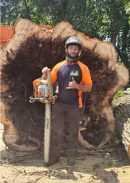• a man trimming a large tree trunk