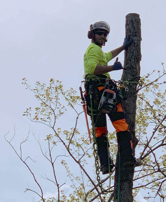 • worker with chainsaw going to trim
